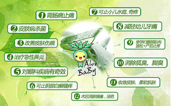 蘆薈性味苦寒、入肝、心、脾經。主要成分分為蘆薈大黃素甙、異蘆薈大黃素甙、蘆薈甙等。具有瀉下通便、清肝泄熱、消疳殺蟲的功效,用於治療熱結便秘、小兒驚癇、疳熱蟲積、癬瘡、痔瘺、萎縮性鼻炎、瘰鬁。現代醫學研究證明,蘆薈對腸胃病、肝病、糖尿病、心臟病、高血壓等均有不同程度的輔助療效,尤其對各種灼傷、燙傷和曬傷有顯著療效,且可能有抑制病毒、黴菌和癌細胞的作用。
